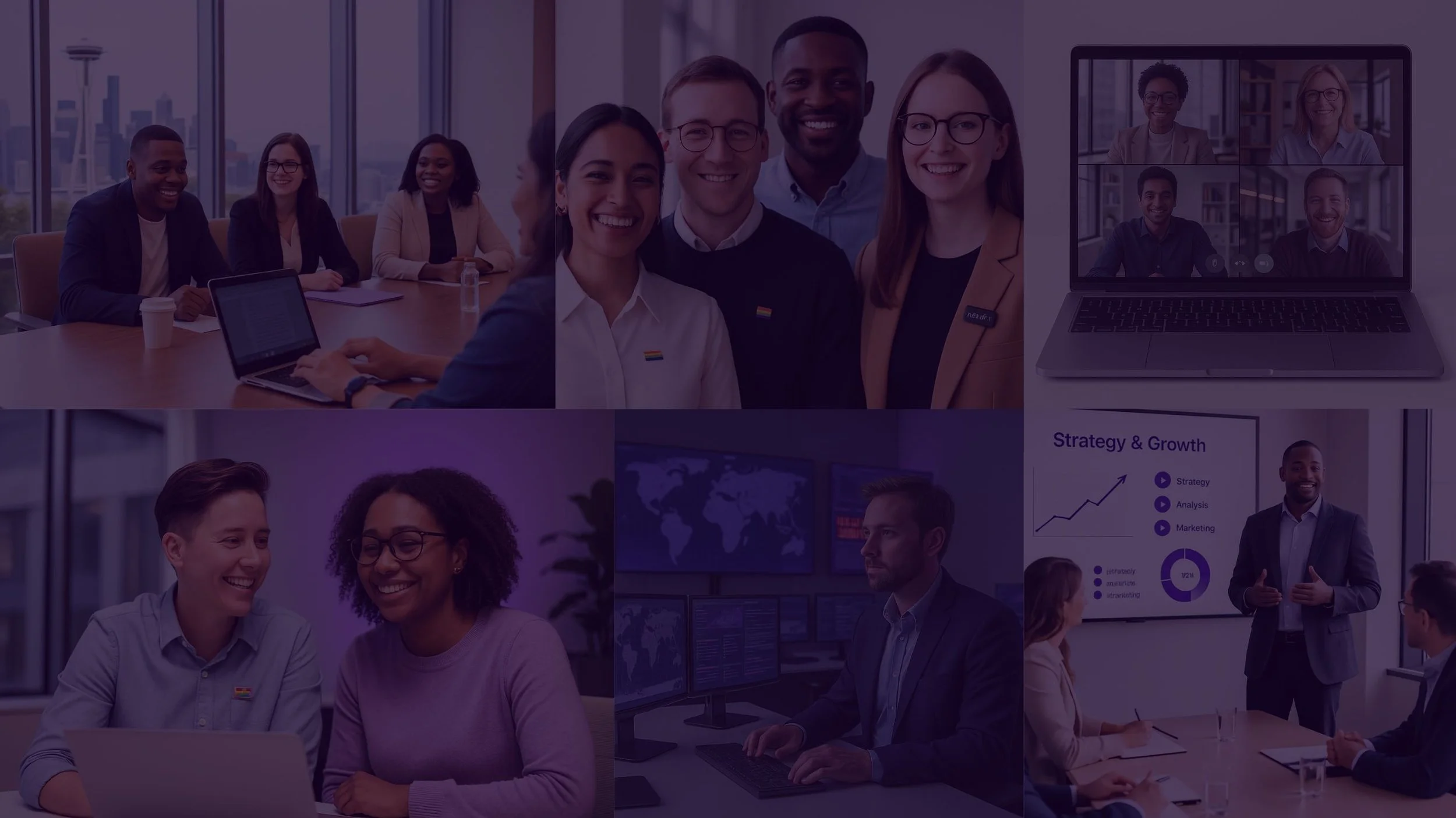 Diverse business team collaborating in meetings, video conferences, and strategy sessions with technology and growth presentations.